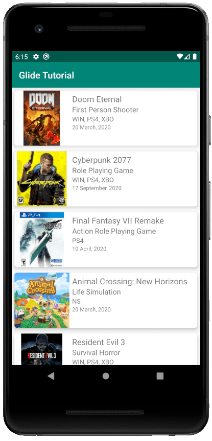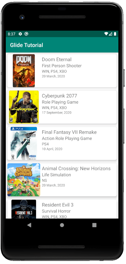 The screenshot below shows a RecyclerView containing a list of video games each inside a CardView showing the box art image on the left, loaded using Glide and information about the video game on the right.