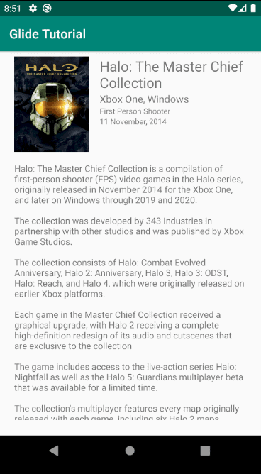 To demonstrate how to use Glide I will create a simple Android app that will display information about a video game such as the title, platforms supported, genre, initial release date, description and box art. We will be using Glide to load the box art image for the video game into an ImageView.