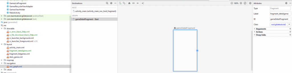 Next we will go into the Navigation Editor in Android Studio by clicking on the navigation graph resource file and selecting the “Design” tab. In the Navigation Editor we will add the GameDetailFragment as a new destination to the navigation graph. The GameDetailFragment will be the start destination for the navigation graph.