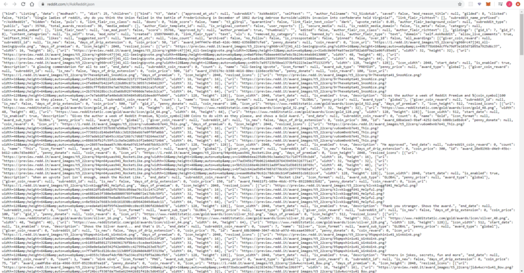 You should see the JSON file look something like this in your browser which contains posts corresponding to the subreddit you selected in your URL.