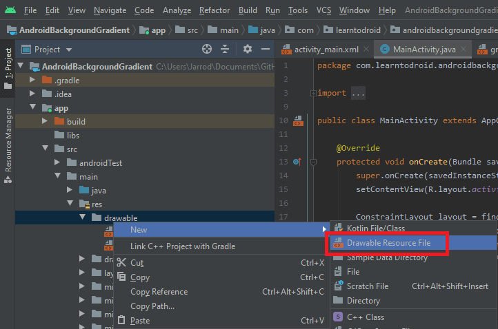 Switch your project in Android Studio into Project mode and navigate into the /app/src/main/res/drawable folder. Right click on the “drawable” directory, hover over the “New” item and select the “Drawable Resource File” item.