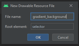 Then the “New Drawable Resource File” dialog will appear. Provide a file name for the drawable resource file you will use for the gradient background and set the root element to “selector”. Then press the “OK” button to create the drawable resource file.