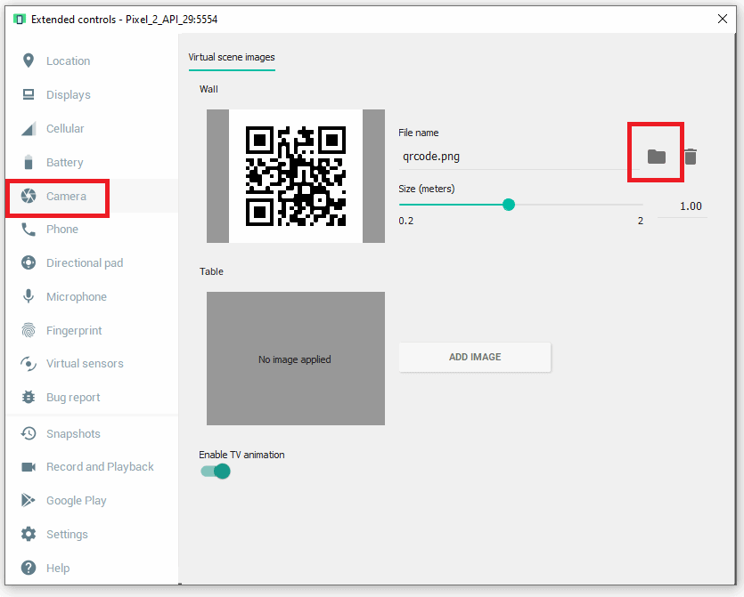Then you will need to go into the camera settings of the emulator and add an image of the QR code as the wall image by selecting the browse icon.