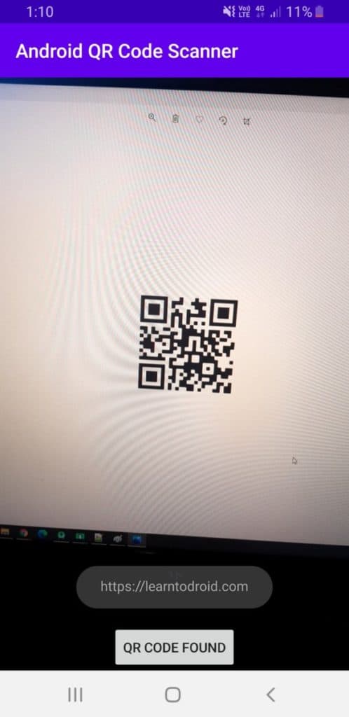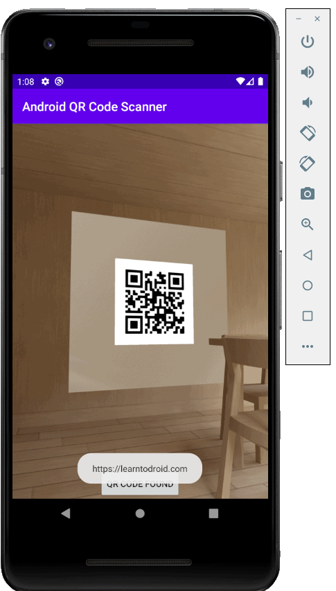 If you have your QR code scanner running on your mobile device, simply point the camera at the screen showing a QR code you have generated and it should display the “QR Code Found” button which when clicked will display the text in a toast message.