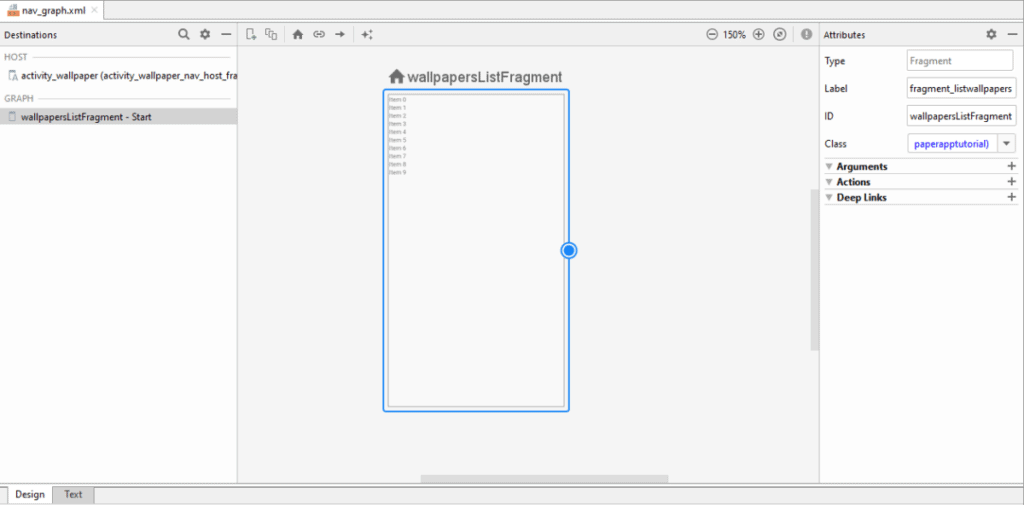 Then you will need to add the WallpapersListFragment destination to the navigation graph as the start destination using the navigation editor in Android Studio shown in the screenshot below.