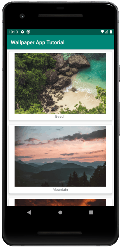 The wallpaper Android app we will be creating will contain a vertical scrolling RecyclerView. This RecyclerView will contain a list of cards for the each wallpaper. The wallpaper card will show an image of the wallpaper and a title underneath.