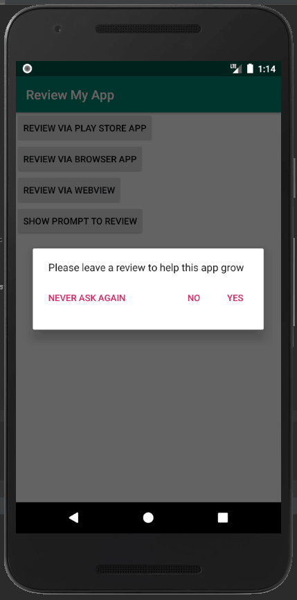- To create this Dialog from the MainActivity class, create a new instance of the ReviewPromptDialogFragment and class the show(…) method on it passing in the FragmentManager and a tag