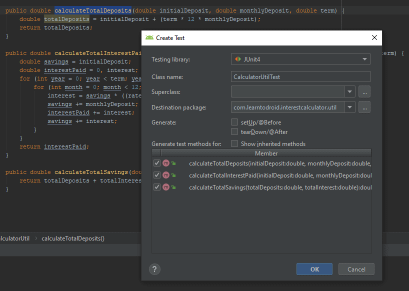 The code snippet below from the CalculatorUtilTest class, available in the InterestCalculator GitHub repo, shows how to use to test the expected value of a method against the actual value calculated through the use of an assert statement with a small margin of error using a delta value.