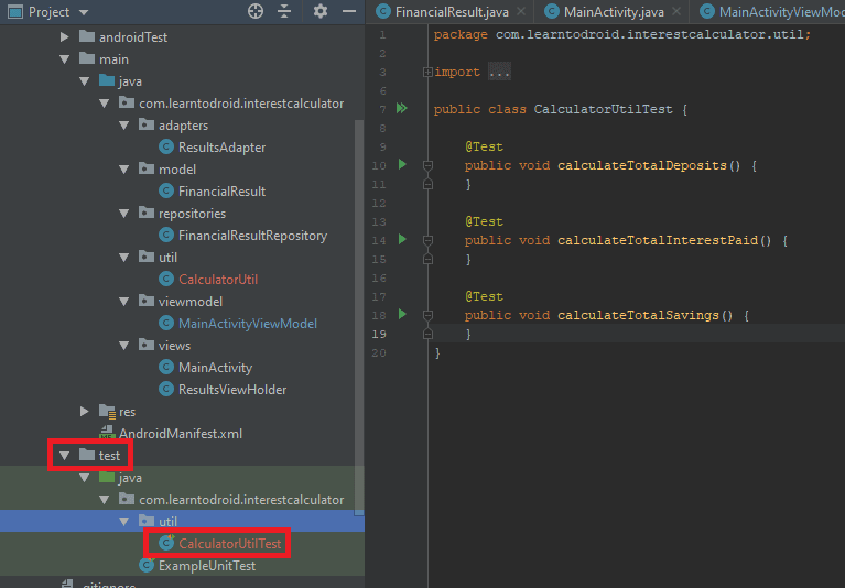To run these local unit tests in Android Studio, select the green icon to the left of the test class name and select “Run CalculatorUtilTest”. This will run all of the tests and show the results in panel at the bottom of the IDE.