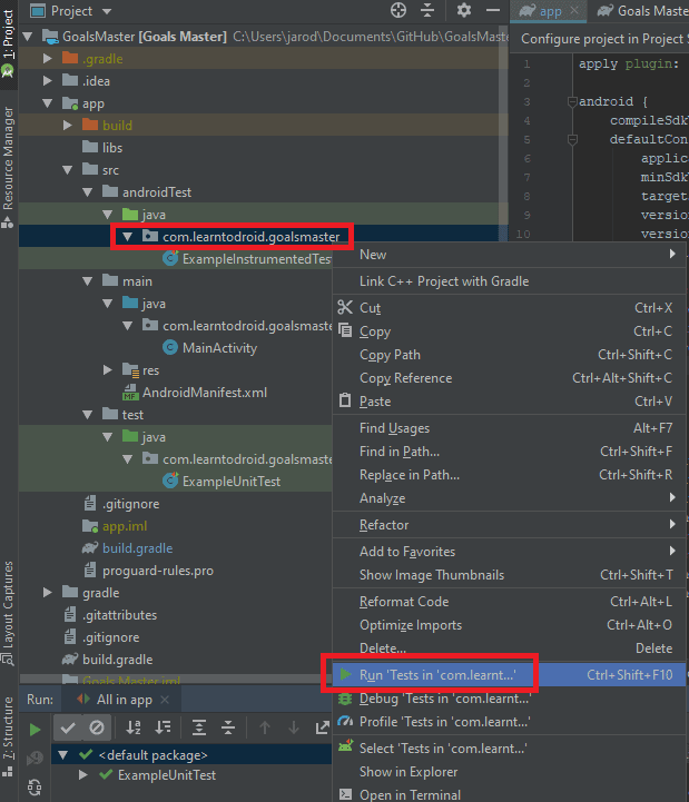 To run your instrumented tests, right click the package inside the androidTest directory, then select “Run Tests in <package name>”. These tests will then be executed inside the emulator.