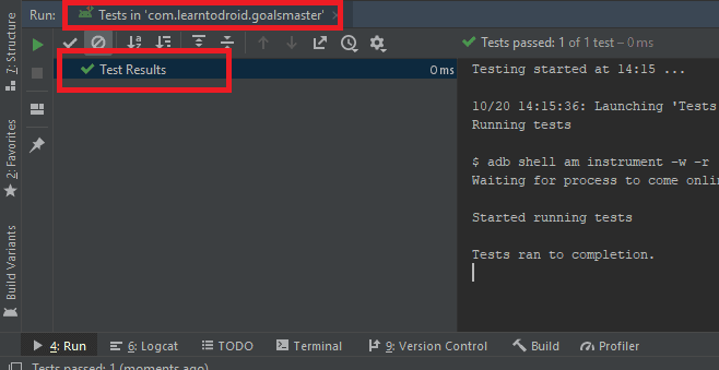 The test results for the instrumented tests will be visible within a tab in the Run results.