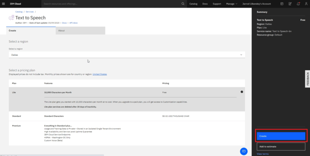 Select the “Text to Speech” service, from there you are able to pick the region your service will be based in. We will want to use the Lite Plan for our Text to Speech service, which currently allows you to perform text to speech on up to 10,000 characters for free per month.