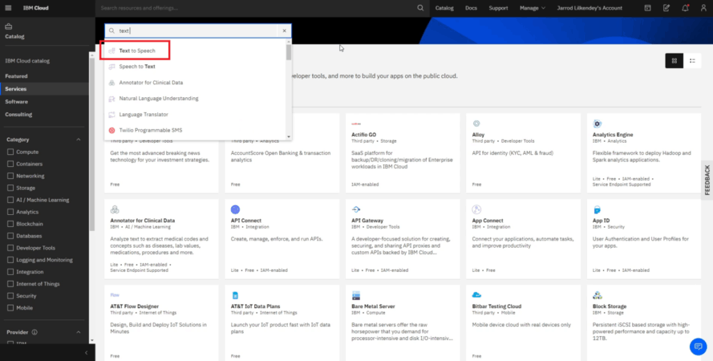 Now that you have created an IBM Cloud account, what you will need to do next is create a Text to Speech resource you can use against your account.