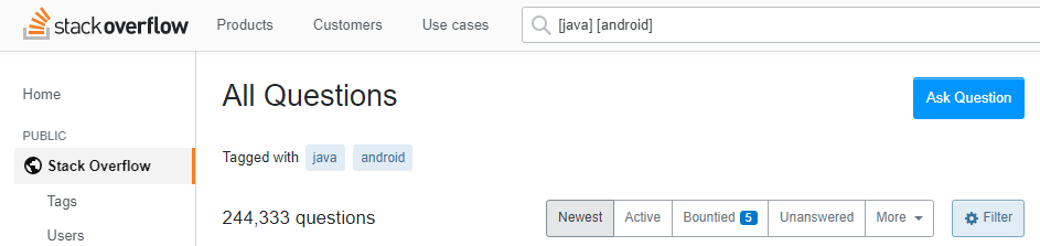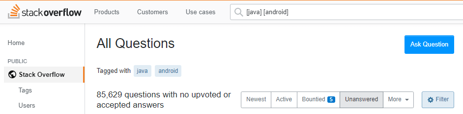 At the time of writing when searching for questions tagged with Java and Android on Stackoverflow I get a total of 244,333 questions with 85,629 considered not answered by Stackoverflow which equates to roughly 35% of questions asked unanswered.