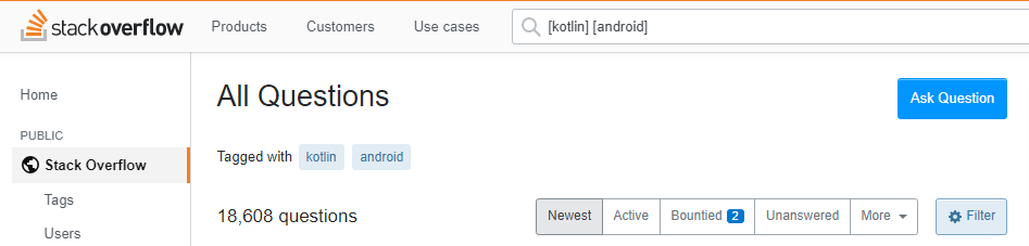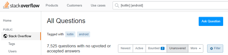 This compares to questions questions tagged with Kotlin and Android on Stackoverflow I get a total of 18,609 questions with 7,526 considered not answered by Stackoverflow which equals approximately 40% of questions asked unanswered.