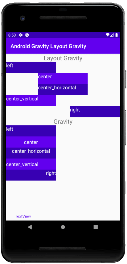 The code sample above for setting the gravity on a TextView widget programmatically will produce the following screenshot.